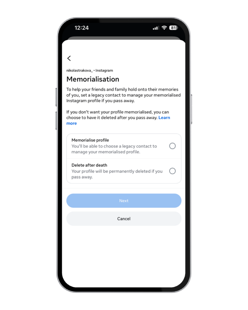 Trochu temnější, ale reálné. Na Instagramu si můžete nastavit jestli se váš profil po smrti smaže nebo „zvěční“ jako pamětní